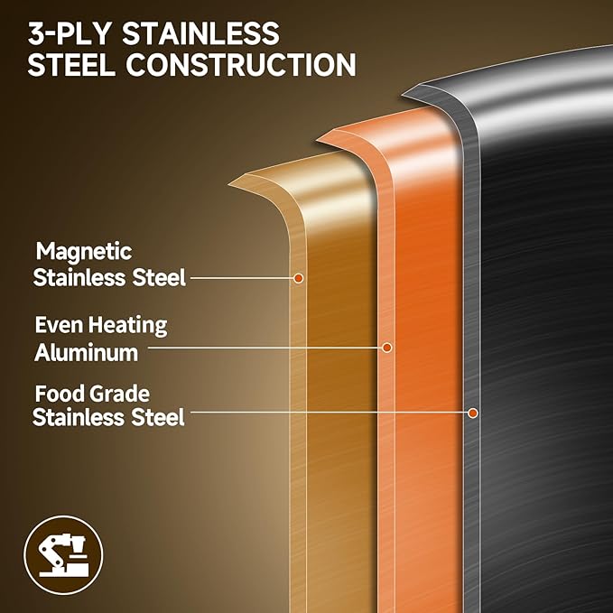 • 【PremiumTri-Ply Construction】LOLYKITCH stainless-steel cookware feature a high-purity aluminum core sandwiched between two layers of durable stainless steel.The 18/0 food-grade stainless steel cooking surface with starburst finish ensures excellent durability, non-reactivity with food, and preserves natural flavors