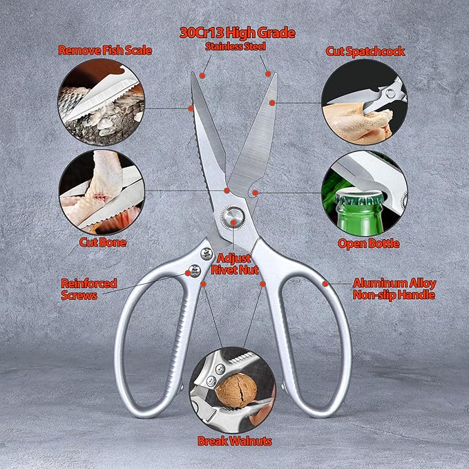 • MORE FUNCTIONS - Sharp scissors can also be used to scrape fish scales, open bottles and crush walnuts or nuts. Clever scissors are also good gifts for mothers, wives, and friends! Give a gift of chef-grade scissors to any culinary enthusiast on the list; they will love the culinary scissors and they will thank you for this thoughtful and useful gift.