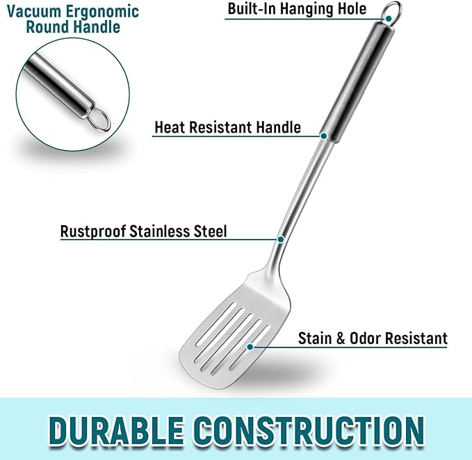 - 【Ergonomic Heat-Resistant Handle】 The long handle of the metal spatula and slotted spatula with hollow heat-proof design that make the handle more heat resistant. The stainless steel spatula detail design of the handle will effectively prevents damage to the hands from excessive temperatures when cooking or serving food. Moreover, the wok spatula ergonomic round handle for easily holding that more comfortable and secure for you to use