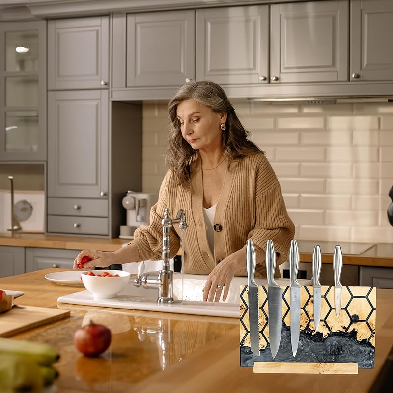 • ✅ EXCLUSIVE KNIFE STAND: This stunning epoxy magnetic knife holder is handcrafted from premium wood and vibrant epoxy resin. More than just functional, it doubles as a unique piece of kitchen decor that adds charm and character to your space. Organize your knives in style with a beautiful, one-of-a-kind storage solution today!