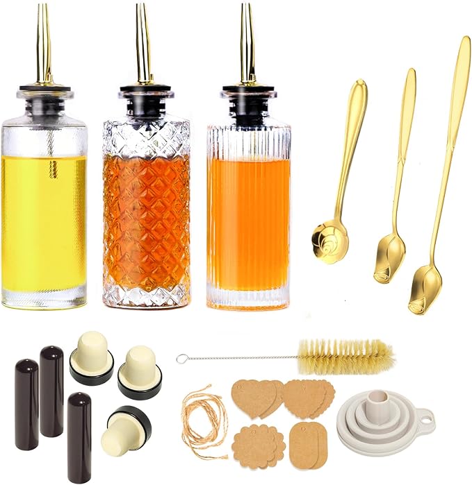 • 【Coffee Syrup Dispenser Set】 Simple syrup bottles set includes 3 different styles of glass bottles, 3 non-drip stainless steel metal pouring spouts, 3 bottle stoppers to prevent you from spilling when you travel with the syrup dispenser, 1 collapsible silicone funnel, 1 brush so you can easily pour new syrup and clean the bottles, comes with twine and 8 label papers so you can mark the liquid in the bottles