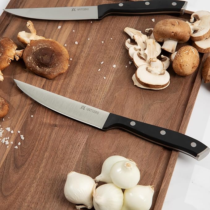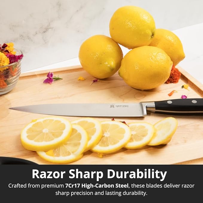 • High Carbon Blades: Made with premium 7Cr17 High Carbon Steel, which provides a razor-sharp, professional-quality blade. The steel contains 0.6-0.75 carbon, making it two times tougher than other knives in its class with a Rockwell Hardness of 57-58.