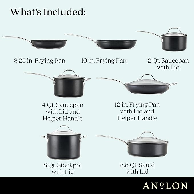• SET INCLUDES: 2-quart saucepan with lid, 3.5-quart sauté with lid, 4-quart saucepan with lid and helper handle, 8-quart stockpot with lid, 8.25-Inch frying pan, 10-inch frying pan, 12-inch frying pan with helper handle and lid