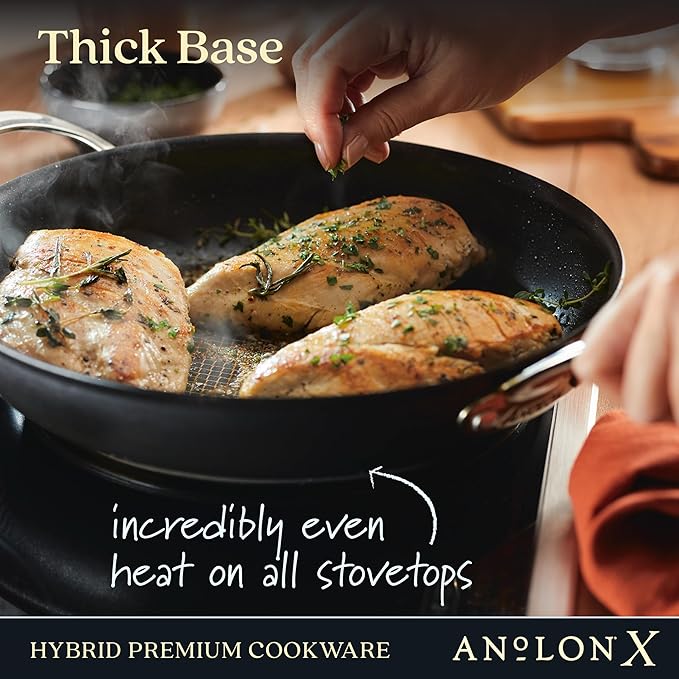 • INNOVATIVE BASE: Hybrid nonstick pots and pans feature a thick, uniquely constructed stainless steel base that delivers incredibly even heat on any cooktop, including induction