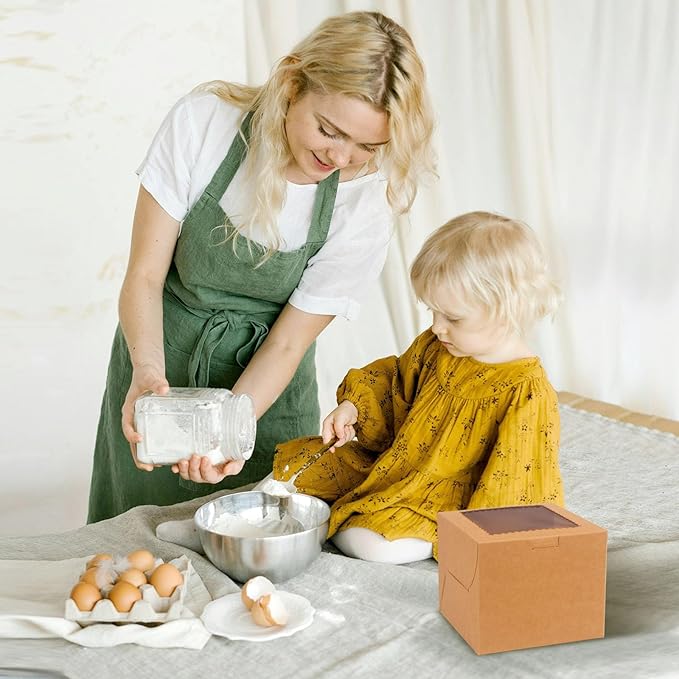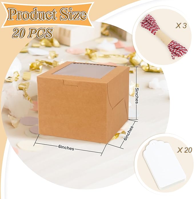 20Pcs Mini Cake Boxes with Window, 6x6x5 Inches Brown Bakery Boxes, Small 4 Cupcake Boxes, Cake Packaging for Pastries, Cookies, Chocolates, Cupcakes, Birthday Party, Wedding