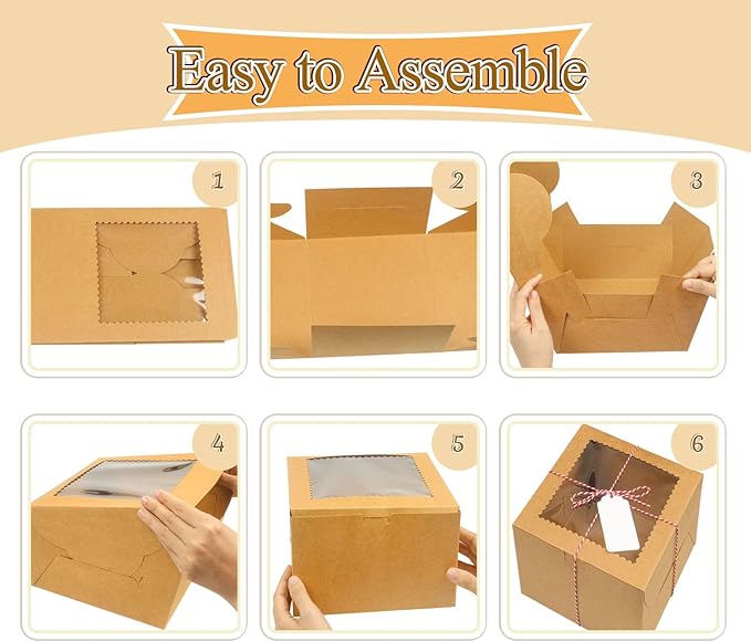 • 【Quality Material】Crafted from durable cardboard material, these cake packaging boxes are safe and reliable, provide a robust packaging solution, protecting your cakes from external elements and ensuring they arrive in perfect condition. Make your gifts or desserts stylish and memorable with the brown cake boxes.