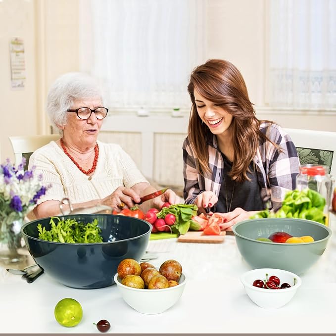 • 🍓【Stackable & Easy to Clean】: These nesting mixing bowls for kitchen can be stacked on top of each other to save space. The plastic bowls with lids are top-rack dishwasher friendly and can also be hand washed with soap and water (avoid the use of abrasive sponges).