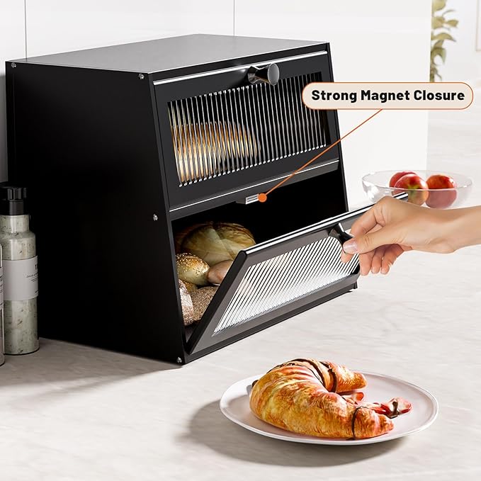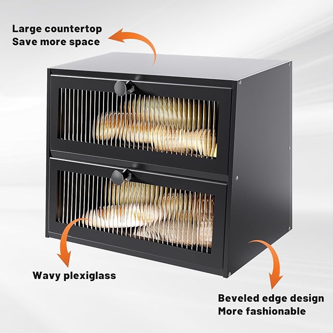 • 【Multifunctional Organization】: The double layer extra large bread box can be used not only for bread, but also for storing other baked goods, fruits,Potatoes, onions,condiment bottles and other kitchen supplies, keeping your kitchen organized and clutter-free.