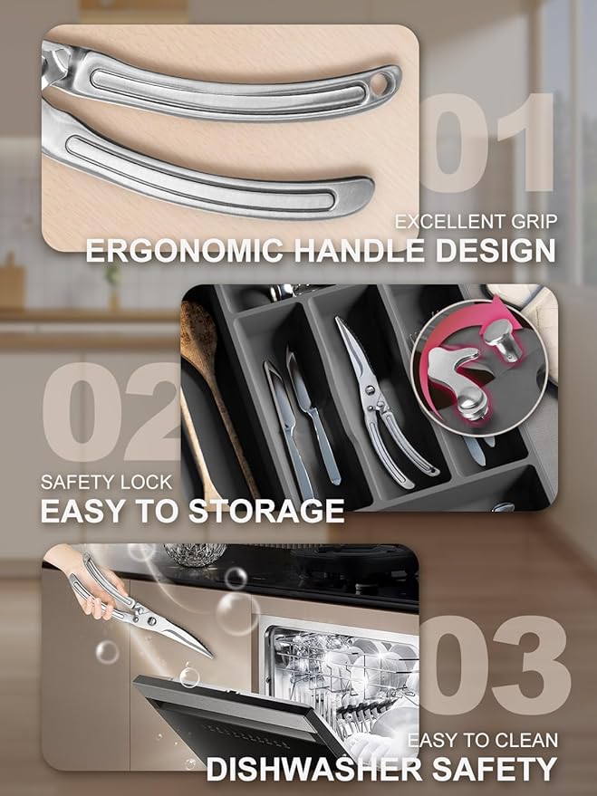 • Safety Assurance:Our heavy duty kitchen shears for food are thoughtfully designed with a safety lock.When not in use,simply lock the scissors in the closed position to prevent accidents.The locked handles also make storage more convenient,helping you keep your kitchen organized;