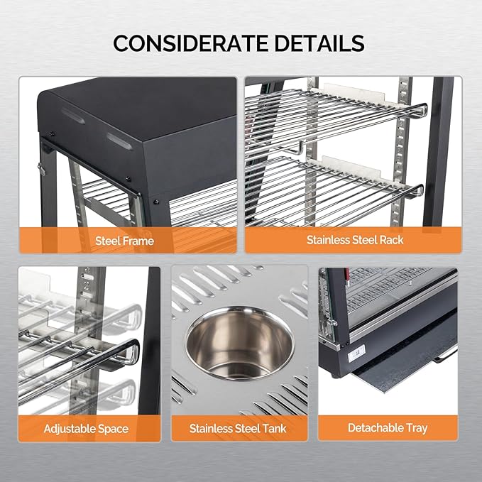 • 【Durable Material】Stainless-steel frame and racks are durable and corrosion-proof, which won’t be out of shape when carrying a lot of food. Tempered glass walls and doors ensure long lifespan and safe operation. Anti-skid feet at the bottom for stability
