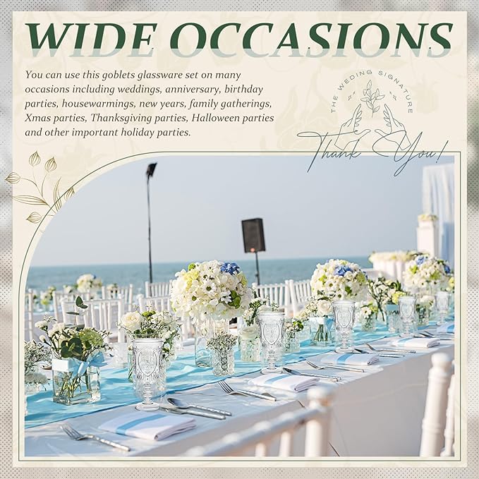 • Package Includes: you will receive a package of 48 vintage stemware with a 7.5 oz capacity; Whether it's wine glasses for a sophisticated dinner party or juice glasses for a casual Sunday brunch, we have the quantities to meet your use and replacement needs