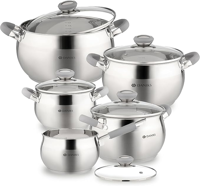Daniks Modern 10-Piece Stainless Steel Induction Cookware Set – Dishwasher Safe Saucepan, Pots with Heatproof Handles, Glass Lids, Silver