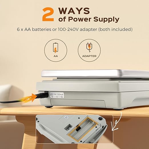 • Two Powering Modes-The food weighing scale can be powered both by 100-240V AC adapter (included) and 6pcs AA batteries (included).