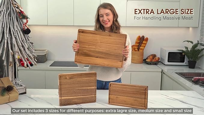 • REAL WOOD: Crafted from 100% ACACIA wood, our wooden cutting boards set with holder which are not only durable but also natural, ensuring the safety of your family's meals should be the best cutting boards for your kitchen. Bulk of three different sizes from giant to medium and small allows different kitchen tasks.