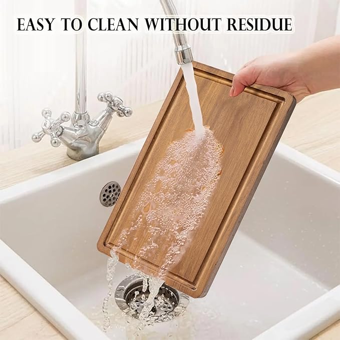 • VERSATILE AND PRACTICAL: The board offers a smooth cutting surface and edges, making it pleasant to use during food serving & easy to clean afterward. Dual-Sided Use with one side featuring a juice canal for meats and the other side for vegetables. Beside, you can also use the wooden chopping boards for your CNC router project as decoration function.