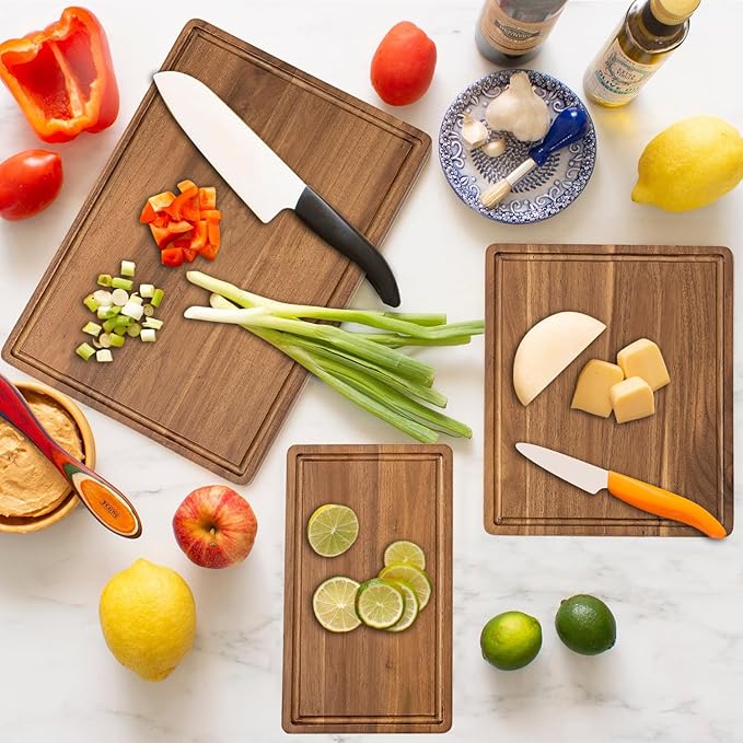 • Included Components : 3 pc wood cutting boards for kitchen with handle