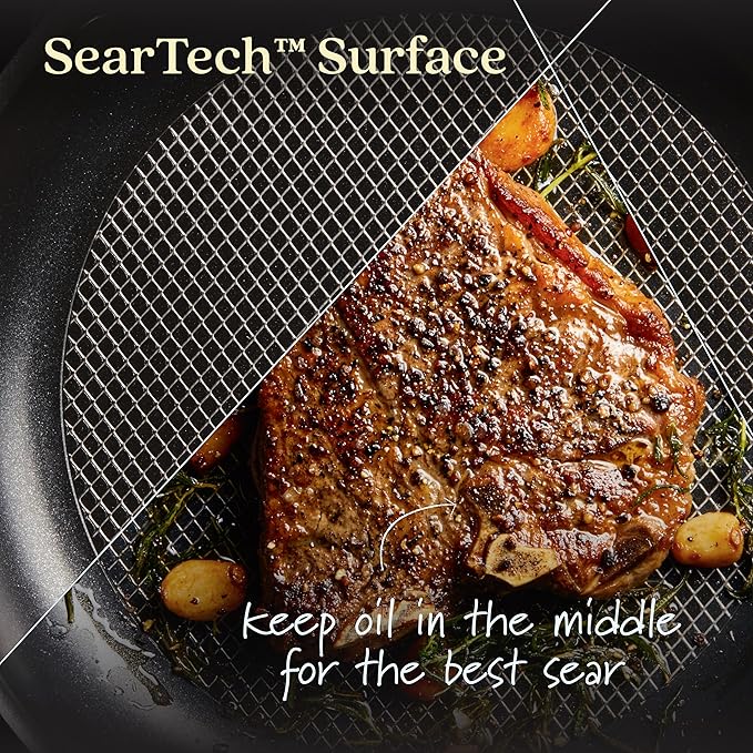 • THE ULTIMATE SEAR: No other nonstick frying pans have it. Exclusive SearTech(tm) technology combines an innovative base and stainless steel mesh engineered to keep oil in the middle of the skillet surfaces, letting heat and fats unite for incredible caramelization and browning