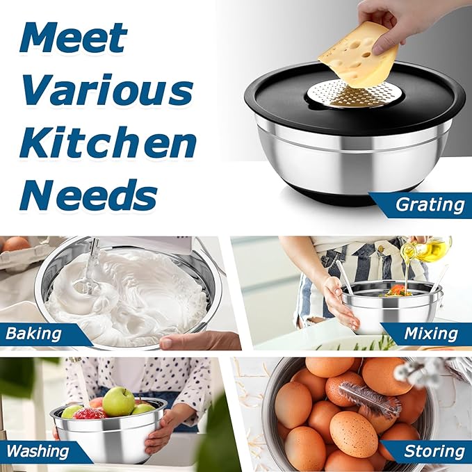 - PLASTIC LIDS & NON-SLIP BOTTOM – Every nesting bowl comes with the matching airtight lid to fit closely, Perfect for keeping food fresh in the freezer and convenient to carry out for a picnic without dust, The 2 protruding parts of the lid help open the lid easily, The non-slip silicone bottom keeps the metal bowls steady on countertop when mixing, beating and whisking and reduces the noise