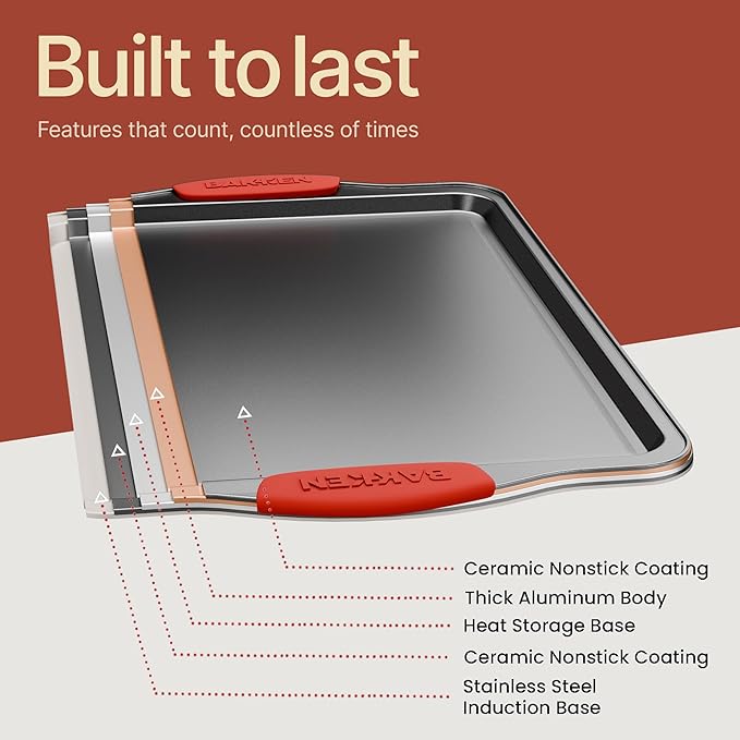 • Convenient Silicone Handles: Equipped with gray silicone handles, these baking pans offer a comfortable grip and stay cool to the touch, providing safety and convenience while handling hot pans.