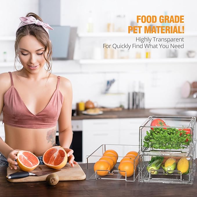 • FOOD GRADE PET MATERIAL : This fruit storage containers for fridge is made of PET plastic, Keep your refrigerator spotless by storing messy items like shredded cheese or leftovers in these food grade fridge drawer organizer, easy to see your groceries at a glance. Great fruit containers for fridge keep fresh