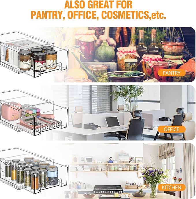 2 Pack Stackable Storage Drawers - Clear Refrigerator Drawers for Refrigerator Organizers and Storage, Acrylic Fridge Drawer Organizer with Handles for Bathroom, Undersink, Cabinet, Pantry, etc