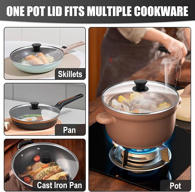 • METAL VENT HOLE FOR SAFE COOKING: This pan cover includes a metal vent to release excess steam and prevent spillovers.Whether you're stewing, baking, or poaching, you can rely on this glass lid for a hassle-free cooking experience.