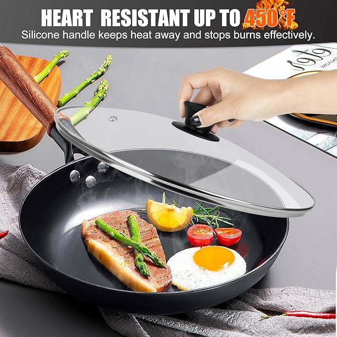 • [TEMPERED GLASS PAN LID] Komokeru's tempered glass lid with stainless steel rim is the perfect addition to your cookware collection.The lid edge is crafted from stainless steel to ensure safe cooking without rust. The high-quality tempered replacement covers seals in moisture and flavor, ideal for use with cast iron skillets, frying pans, and more.