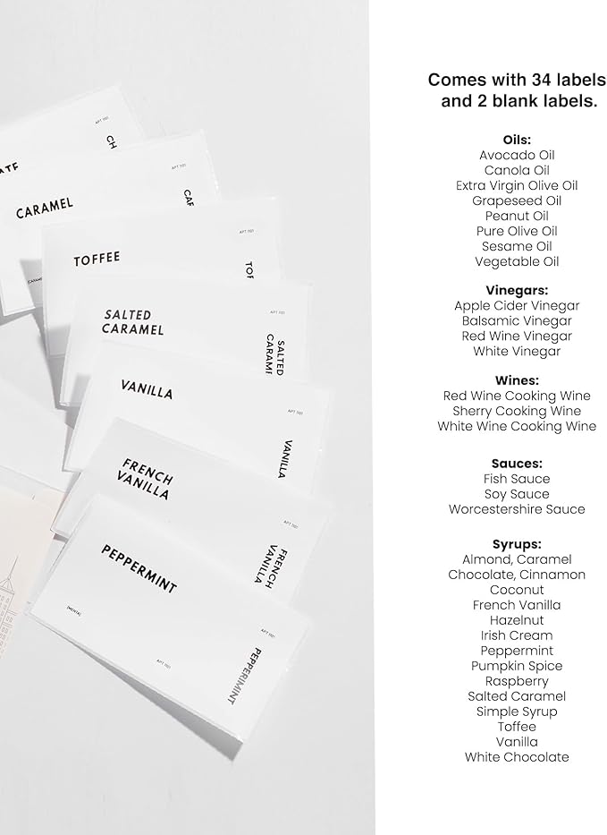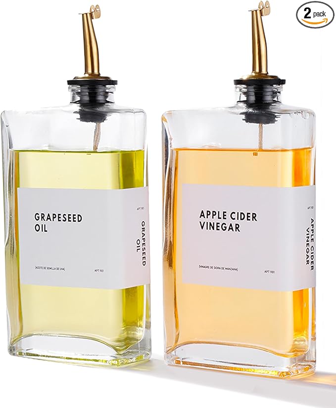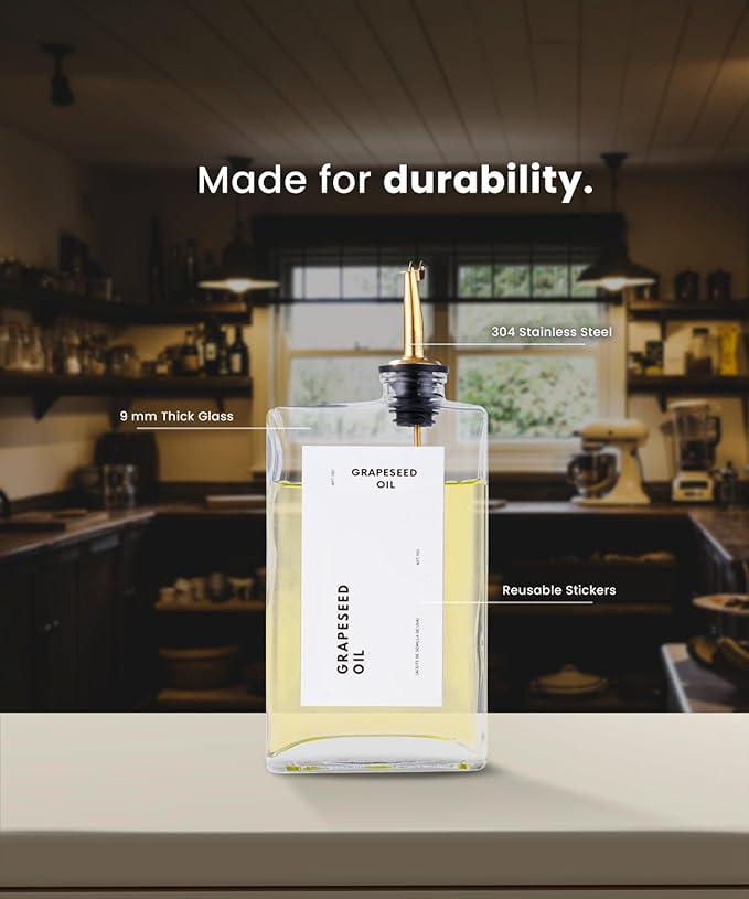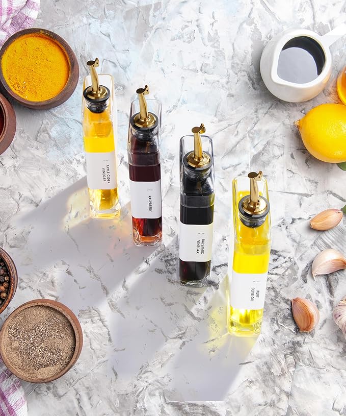 • Versatile Usage. Use it as a drizzle olive oil container, vinegar dispenser, soy sauce bottle, coffee syrup bottle or vinegar and oil dispenser set — this olive oil bottle dispenser suits various needs. It also comes with a 36 designed water-proof, weather-proof label set for your custom use.