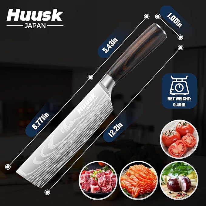 • ๐”๐ง๐ฆ๐š๐ญ๐œ๐ก๐ž๐ ๐•๐ž๐ซ๐ฌ๐š๐ญ๐ข๐ฅ๐ข๐ญ๐ฒ--With its razor-sharp blade and thin profile, the HUUSK Asian Nakiri Knife excels at a wide range of kitchen tasks. From effortlessly slicing through vegetables to finely mincing herbs, it offers unmatched versatility and precision, making meal preparation a breeze.