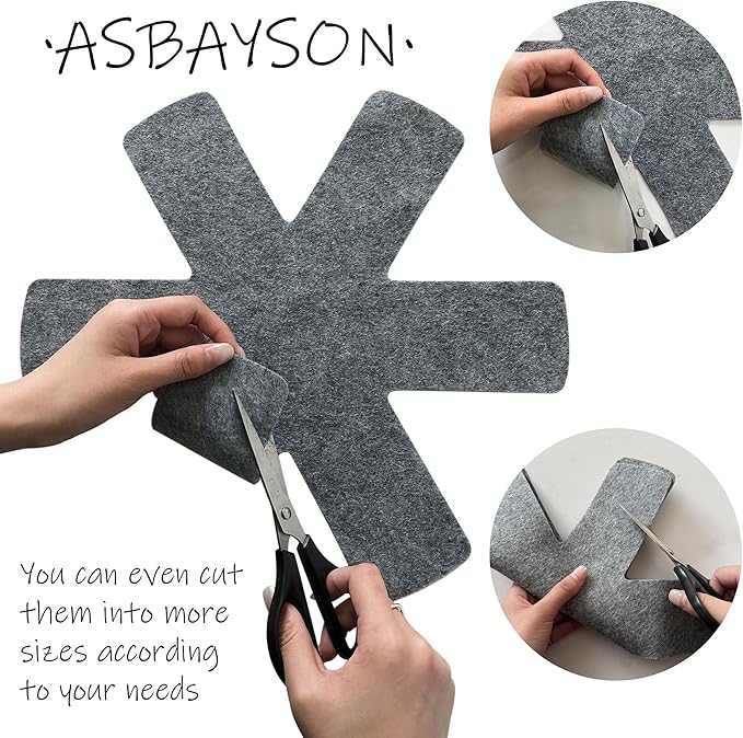 • 12 perfect non-woven pot partition protectors: 4 pieces of each size, with a total of 3 different sizes: large pot protector size: 38X38cm (15X15 inches). Medium pan divider size: 35X35cm (13.8X13.8in). Small flat bottomed pot protective pad size: 26 * 26cm (10.2X0.2inch). Three different sizes are suitable for cooking utensils from small to large, and you can cut them according to your own needs.
