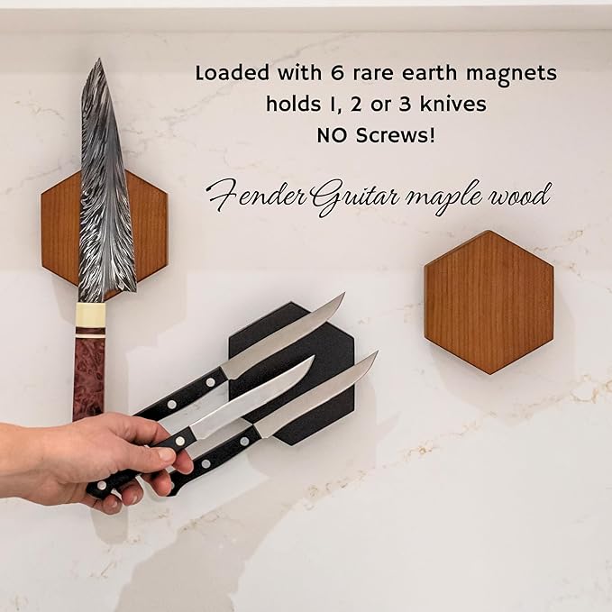 360KnifeBlock magnetic knife HEX - Guitar Wood - 2 Rows of Magnets, 'magic floating backer' 3 sizes from 5" to 26" - handmade in Washington (Guitar Wood, 5" Hexagon)