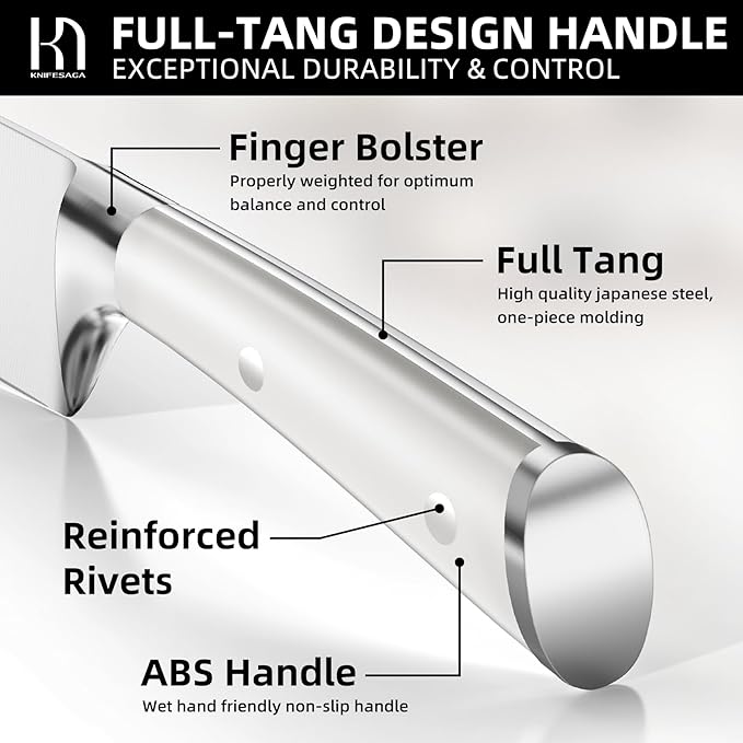 - 【Ergonomic Comfort & Full Tang Durability】Prioritizing your comfort and safety, our santoku knife is expertly designed with ergonomics, featuring a full tang handle that conforms perfectly to your grip. The sturdy and secure half-bolster provides enhanced stability, ensuring fatigue-free cutting for extended periods.