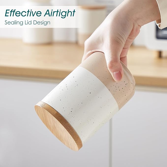 • 【High-quality Material】The canisters are made of high-quality stoneware, which is not easy to crack, and is more durable than plastic and glass. The lid is made of wood, with an environmentally friendly sealing rubber ring to improve the sealing. Effectively keep the items dry and fresh