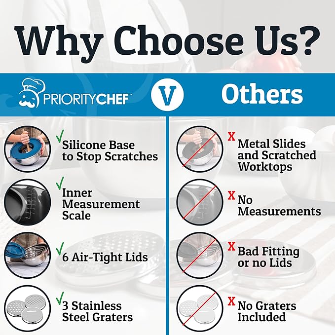 • 3 Steel Graters Included: Grate and slice food directly in the bowl with our innovative grater attachments, speeding up meal prep and minimizing cleanup. Enjoy the simplicity of slicing cucumbers or grating cheese straight into the bowl.