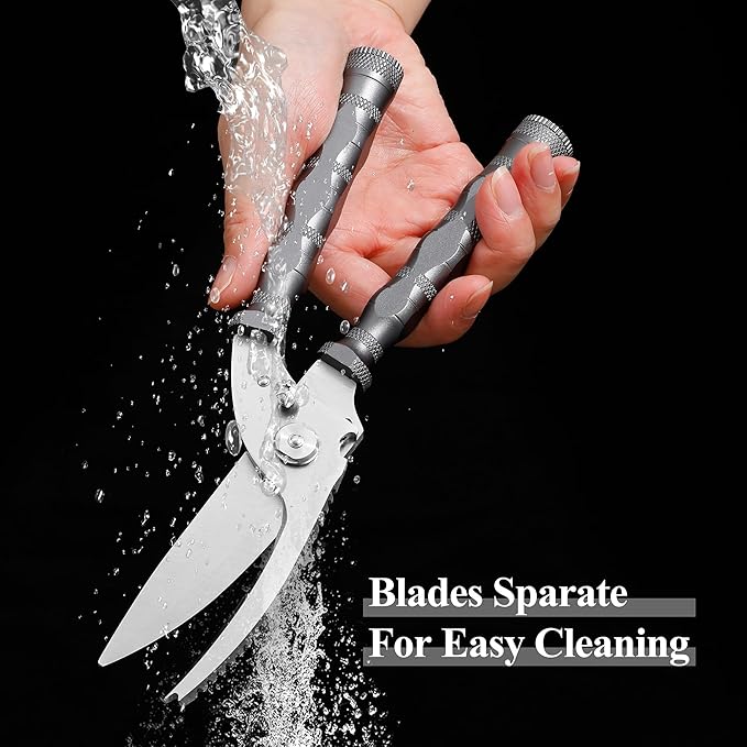 • 【Premium quality ultra-sharp Poultry shears】The high-quality kitchen poultry shears forged from premium stainless steel are sharper and thicker. Kitchen scissors are a professional heavy-duty kitchen scissors with a quick and easy detachable structure where one blade can be turned into a knife. The detachable blade also makes cleaning easier and does not leave a stain on the scissors.