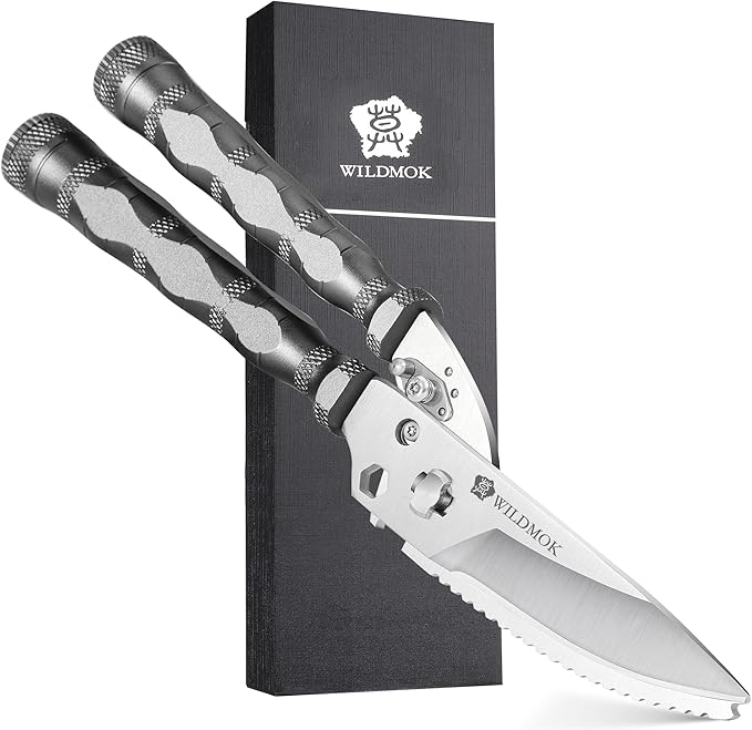 • 【Ergonomic bamboo shaped handle】The ergonomic handles of the kitchen shears makes it anti-slip and offer you a comfortable grip. the aluminum alloy material makes it very strong and durable, not easily deformed. The tail ends has built-in compass and flint, and a safety hammer blaster to increase the convenience of outdoor activities.