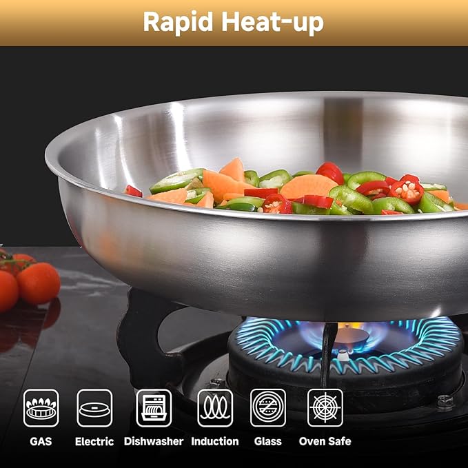 • Triple-Ply Construction for Fast Heating & Energy Efficiency: This stainless steel pan features a premium triple-ply base (stainless steel-aluminum-stainless steel) for rapid, even heat distribution. Retains heat effectively for consistent cooking results while reducing energy consumption, perfect for searing, frying, and simmering