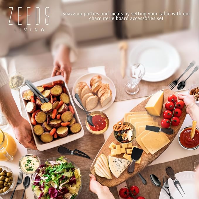 • PREMIUM QUALITY: The Zeeds Living cheese knife is made of premium quality wooden handle and 430 stainless steel blade. The sharp golden blades allow you to cut, chuck, shave, slice, spread, and serve all your favorite cheeses. The spoons, forks and charcuterie tongs also made of food grade stainless steel which is super durable and not easy to rust or bend