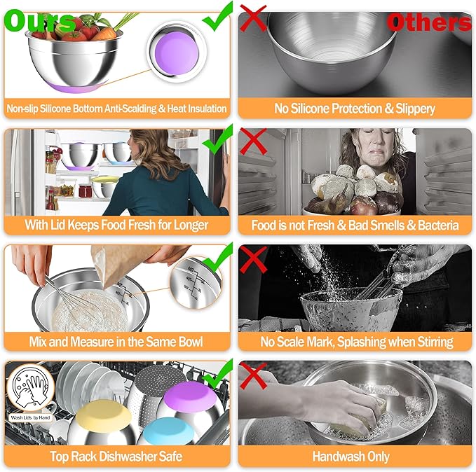 • 【Non-Slip Silicone Bottom & Multiple Sizes】: The mixing bowls stainless steel have a rubber bottom for grip and stability, preventing sliding on countertops and protecting surfaces from high temperatures. The mixing bowl set has 3 sizes (1.5, 2.5, 6 QT ), the metal mixing bowls are QT labeled for selection of the right size, and the bowls are sized to fit standard refrigerator racks and cabinets.