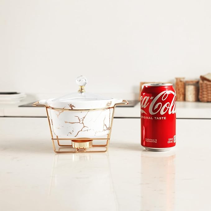 4.9 Inch Ceramic Mini Casserole Dish with Glass Lid and rack, 13.5 Oz Serving Soup Tureen, Chafing Dish for Individual Portion, Chocolate fondue, Fondue Pots Sets for Party Bakery Desserts