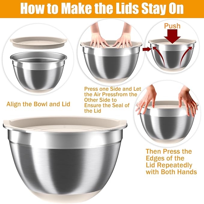 • 【Sealed Lid & Non-Slip Silicone Bottom】: The food storage container set has BPA-free plastic lid to store ingredients, locking in freshness without worrying about spills or leaks. The stainless mixing bowl set has a non-slip silicone base, preventing the nesting mixing bowls with lids from sliding on the countertop while mixing, and the scald-proof insulation protects the table from high temperatures.