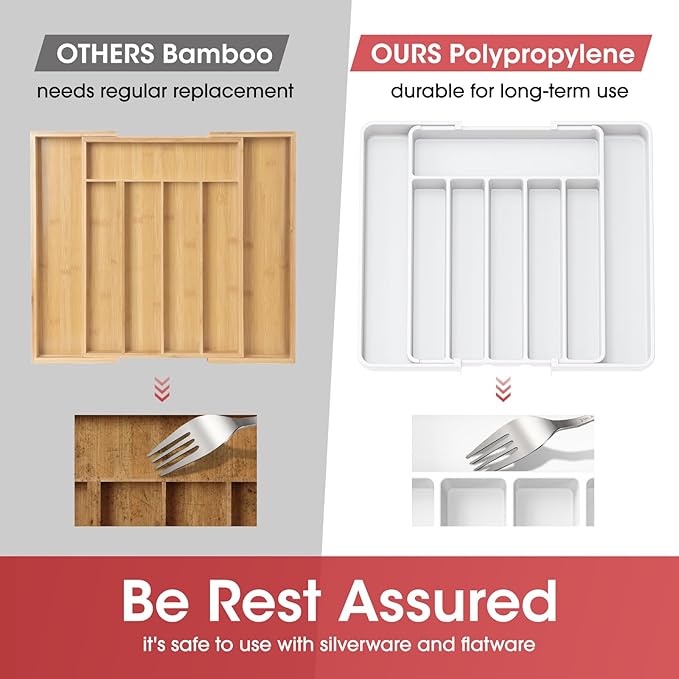 • SAFETY MEETS DURABILITY: AUJEN drawer organizer for kitchen utensils is crafted from premium PP material that is BPA-free and durable for use. Just rest assured that it can guarantee the safety of all your utensils, silverware, and flatware. Cleaning is as easy as a breeze - simply rinse with water or wipe with a damp cloth.