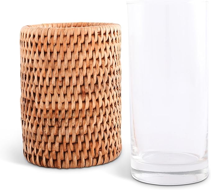 • Tall & Handmade Rattan Glass: Standing at 6 inches tall, this drinking glass is entirely handmade with natural rattan. It adds a touch of boho aesthetic to your home decor, making it perfect for serving juice or tea.