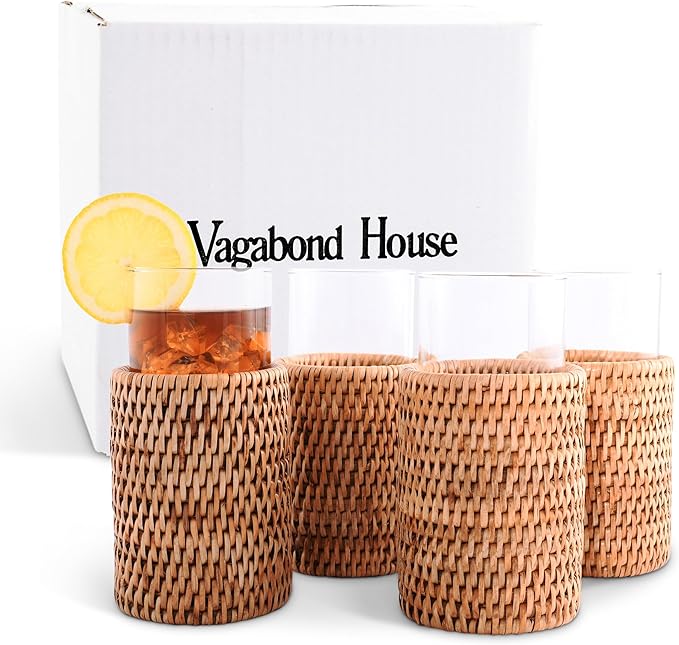 Vagabond House Natural, Removable Glass Water/Juice Glasses Set of 4, Handmade, Tall 6 Inches, Perfect for Kitchen and Home, Covered with Hand Woven Wicker Rattan