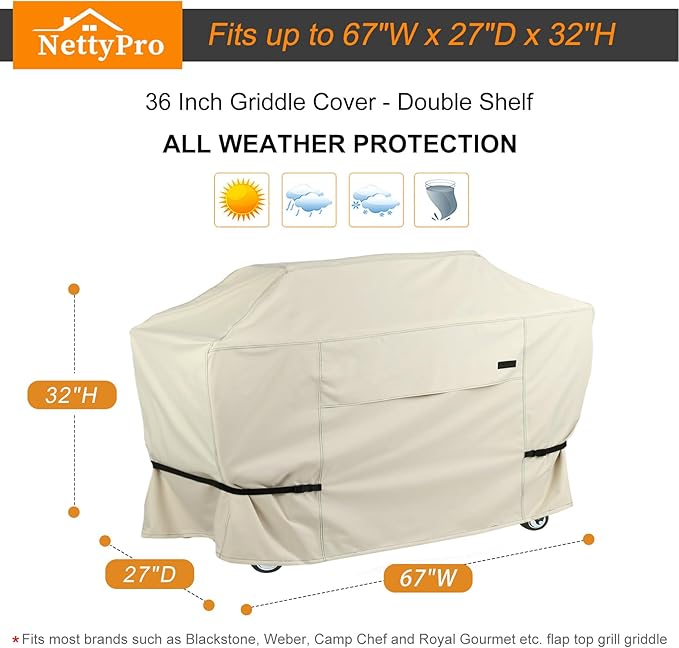 • Dimensions: This 36" griddle cover is guaranteed to fit griddle size up to 67" Length x 27" Width x 32" Height. Fits most brands griddle with 4 burners like Blackstone, Weber. Please measure carefully before purchasing