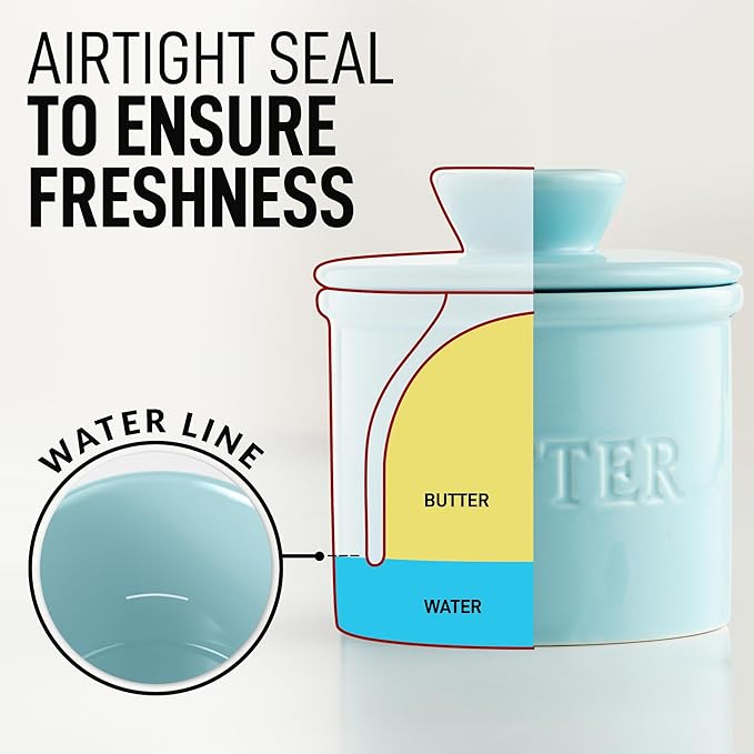 • AIRTIGHT FRESHNESS: Our porcelain butter crock keeps your butter fresh by using a water-filled base that creates an airtight seal. The bell of this butter crock comfortably holds a whole stick, ensuring you always have delicious, spreadable butter on hand.