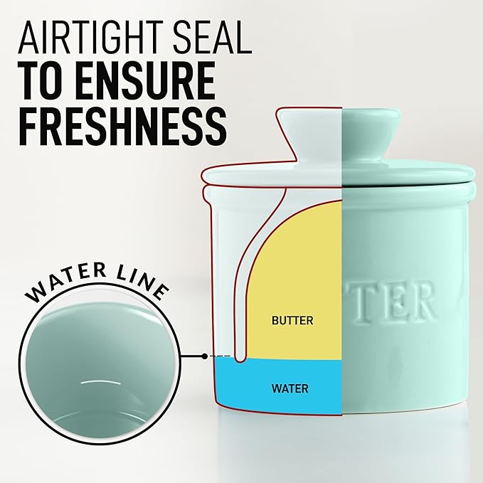 • AIRTIGHT FRESHNESS: Our porcelain butter crock keeps your butter fresh by using a water-filled base that creates an airtight seal. The bell of this butter crock comfortably holds a whole stick, ensuring you always have delicious, spreadable butter on hand.