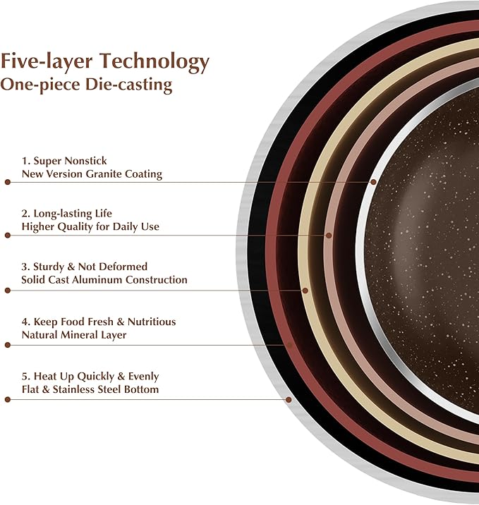 • New Technology of Composite Coating - Improved harder granite,10X enhanced for long-lasting nonstick performance. Free of Intentionally Added PFOA, smokeless, safe & healthy. Cooking with little oil for healthy diet.