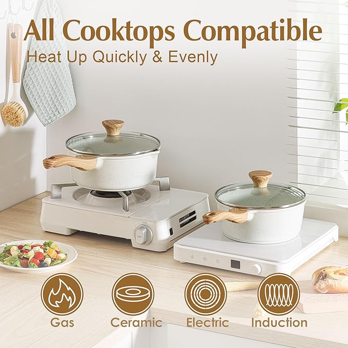 • Suitable For All Stoves - High magnetic conductive stainless steel base allows the 3 qt saucepan with lid nonstick to work on all cooktops, including induction, glass stovetop. The core of sauce pan is made of cast aluminum, which is sturdy, long-lasting and heats up quickly and evenly.