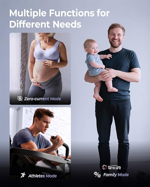 • Friendly Features: 1) Unlimited Users makes it convenient for the whole family; 2) Zero-Current Mode ensures a safe weighing option for expectant mothers; 3) Family Mode tracks the growth of babies or pets; 4) Athlete Mode povides more accurate and suitable data for athletes